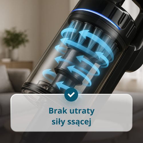 • System multi-cyklonowy utrzymuje moc ssania nawet przy pełnym pojemniku.