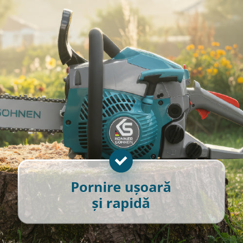 • Pornire ușoară și rapidă – sistemul combină butonul automat STOP, pompa manuală de combustibil (primer) și demarorul cu arc suplimentar, asigurând pregătirea fierăstrăului pentru lucru în orice moment.